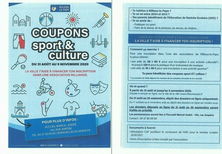 Comme chaque année le dispositif Coupons Sport est en route ! Pour celles et ceux qui perçoivent l'allocation de rentrée scolaire, qui vivent à Rillieux et sont nés (nées) entre 2004 et 2014. Attention date de fin le 9 novembre 2020.