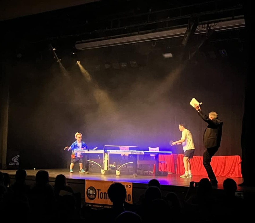 A priori, la thème ne prête pas à l'humour et pourtant, les joueurs, de vrais professionnels (Li Jian Min, Champion de Chine & Thomas Bouvais, n°2 mondial en Handisport, médaillé de bronze au Jeux paralympiques de Tokyo) plongent le public dans un tour du monde détonnant. Grâce à eux, il découvre le jeu à l'américaine, le << porte-plume >>, méthode chinoise de tenir la raquette ou encore le jeu sur des tables cubaines, dites les as, de toute petites tailles.